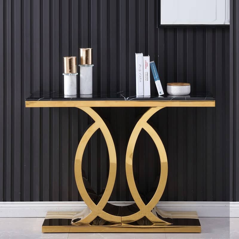 Bàn console sang chảnh được làm từ hợp kim mạ vàng PVD và mặt bàn đá tự nhiên, mang lại một sản phẩm có độ bền cao và vẻ đẹp trường tồn. Hợp kim mạ vàng PVD giúp bàn luôn sáng bóng và không bị phai màu theo thời gian, trong khi mặt bàn đá tự nhiên mang lại vẻ đẹp tinh tế và sang trọng cho không gian phòng khách.