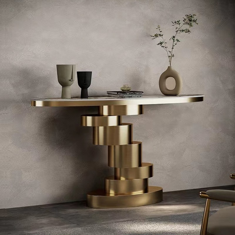 Trong thế giới nội thất hiện đại, bàn console không chỉ đơn thuần là một món đồ trang trí, mà còn là một tác phẩm nghệ thuật, là yếu tố quan trọng trong việc tạo dựng không gian sống hoàn hảo. Nếu bạn đang tìm kiếm một sản phẩm decor phòng khách vừa đẹp mắt, vừa mang lại cảm giác sang trọng và hiện đại, thì chiếc bàn console độc đáo này chắc chắn sẽ là sự lựa chọn tuyệt vời. Với kích thước D120cm x R40cm x C85cm, chất liệu hợp kim mạ vàng PVD kết hợp với mặt bàn đá cao cấp, bàn console này chắc chắn sẽ là điểm nhấn ấn tượng trong mọi không gian.