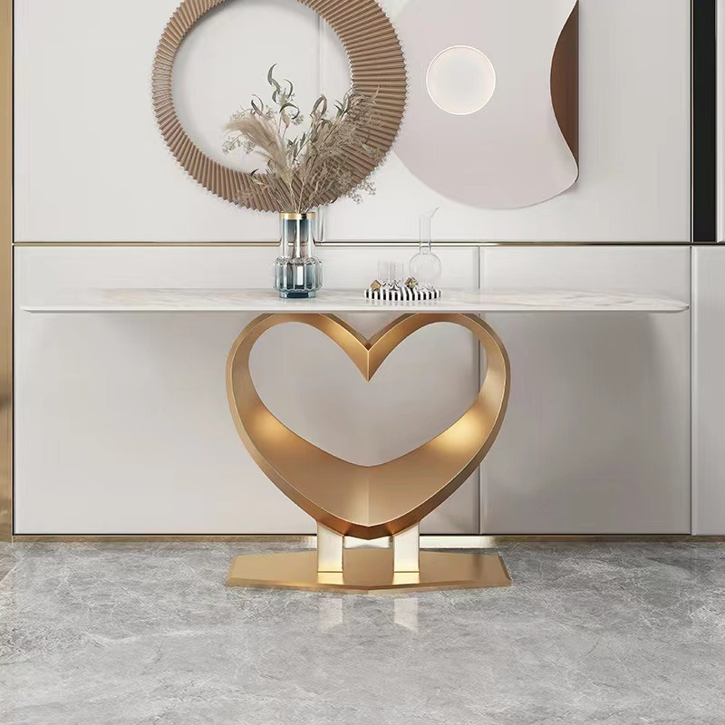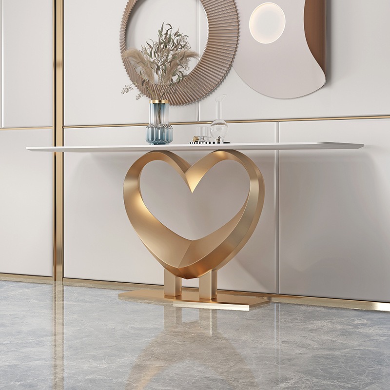 Bàn console trang trí hình tim có thiết kế rất đặc biệt và sang trọng, với phần chân bàn tạo thành hình trái tim mềm mại nhưng vẫn rất vững chắc. Thiết kế này không chỉ mang đến vẻ đẹp hiện đại, lãng mạn mà còn thể hiện sự tinh tế và gu thẩm mỹ của gia chủ. Bàn console hình tim là lựa chọn tuyệt vời để tạo ra không gian sống sang trọng và độc đáo.