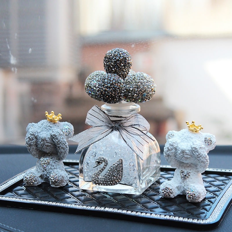 Bộ sản phẩm này có màu sắc nhẹ nhàng và tinh tế, với gấu Teddy màu trắng kết hợp với các chi tiết vàng của vương miện và đá pha lê lấp lánh. Kích thước của sản phẩm là rất phù hợp để đặt trên taplo xe mà không chiếm quá nhiều diện tích nhưng vẫn đủ tạo điểm nhấn. Kích thước cụ thể của sản phẩm là R3.5cm x C5cm cho gấu, D5.2cm x C13cm cho bình bóng và đệm dài 17cm, phù hợp với mọi loại xe hơi.