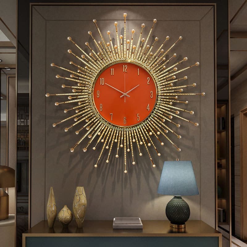 Đồng hồ treo tường hình mặt trời với mặt màu cam nổi bật