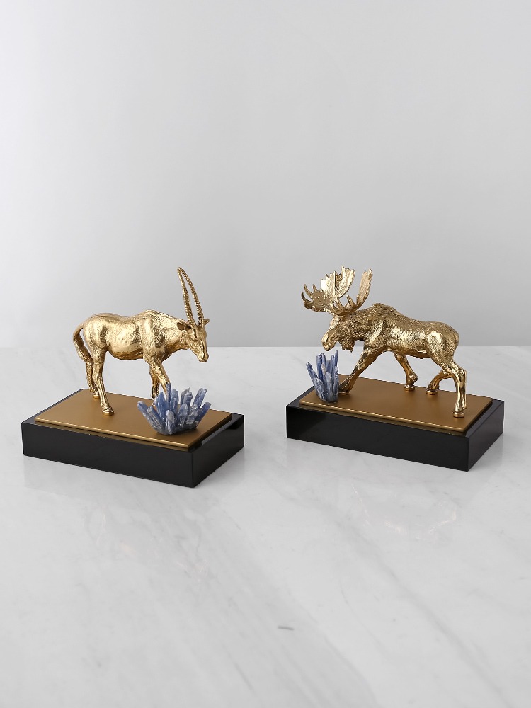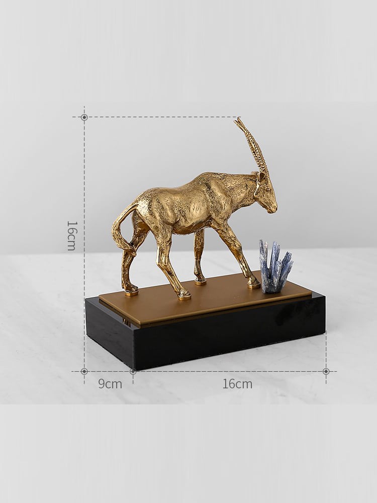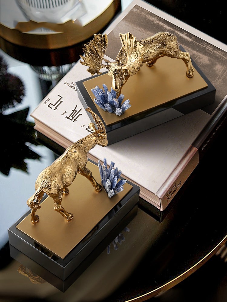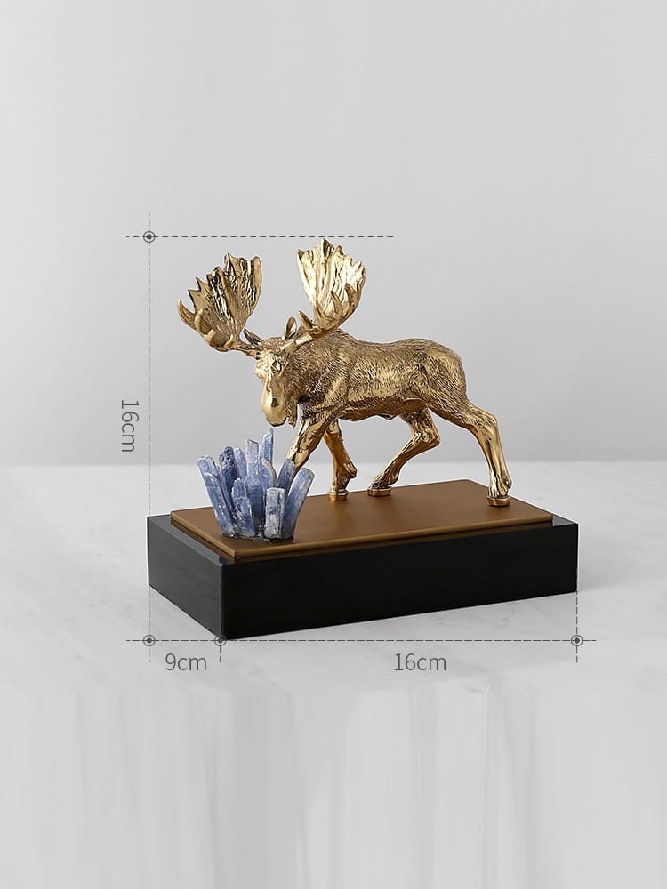Chất liệu đồng và pha lê aquamarine giúp mô hình hươu sừng tấm không chỉ có tính thẩm mỹ cao mà còn rất bền vững theo thời gian. Đồng mang lại vẻ đẹp cổ điển, quý phái, trong khi pha lê aquamarine làm tăng thêm sự sang trọng và lấp lánh cho mô hình. Các chi tiết được chế tác tinh xảo từ đồng, giúp tạo ra những đường nét sắc bén và rõ ràng, trong khi pha lê aquamarine mang lại sự trong suốt, thanh thoát cho tổng thể sản phẩm.