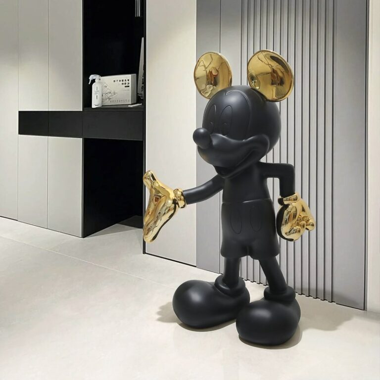 Mô hình chuột Mickey trang trí sảnh mang thiết kế tối giản và hiện đại, không cầu kỳ nhưng vẫn tạo được sức hút mạnh mẽ. Mô hình với những đường nét đơn giản nhưng tinh tế, giúp làm nổi bật không gian mà không gây cảm giác rối mắt. Phong cách tối giản hiện đại trong thiết kế tượng thể hiện sự tinh tế và khả năng hòa nhập vào mọi không gian phòng khách hiện đại, giúp không gian trở nên sang trọng và tinh tế hơn.