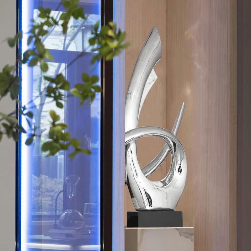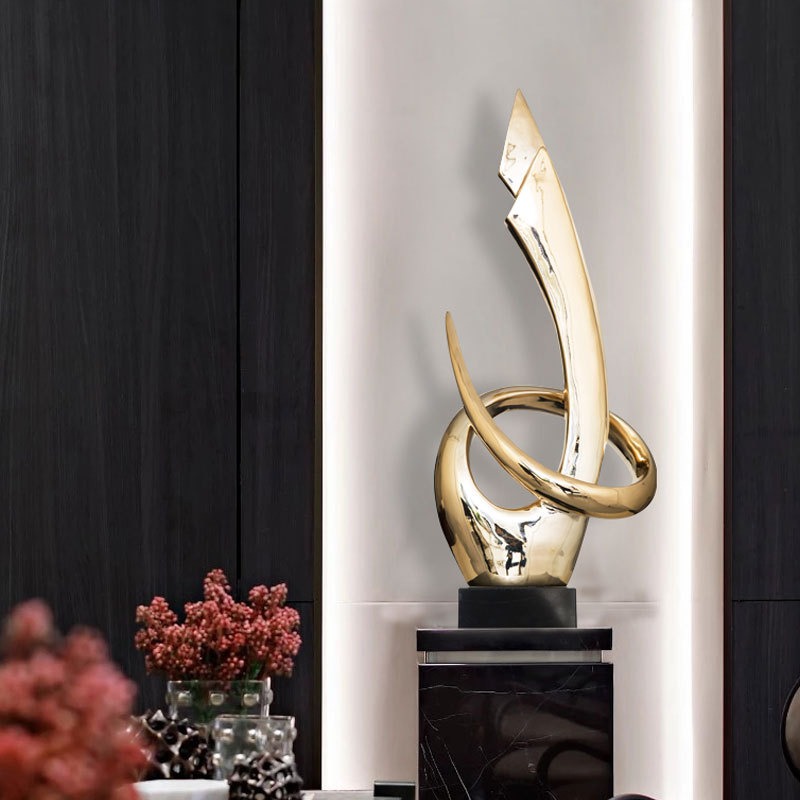 Chất liệu composite và sợi thủy tinh được sử dụng trong mô hình điêu khắc này không chỉ đảm bảo độ bền cao mà còn mang lại vẻ sáng bóng, hiện đại cho sản phẩm. Composite giúp tạo hình các chi tiết sắc nét và chắc chắn, trong khi sợi thủy tinh mang lại sự linh hoạt và dễ dàng tạo ra những hình dáng mềm mại, uốn lượn. Sự kết hợp này tạo ra một tác phẩm nghệ thuật vừa bền bỉ, vừa tinh tế, phù hợp với những không gian phòng khách hiện đại và sang trọng.