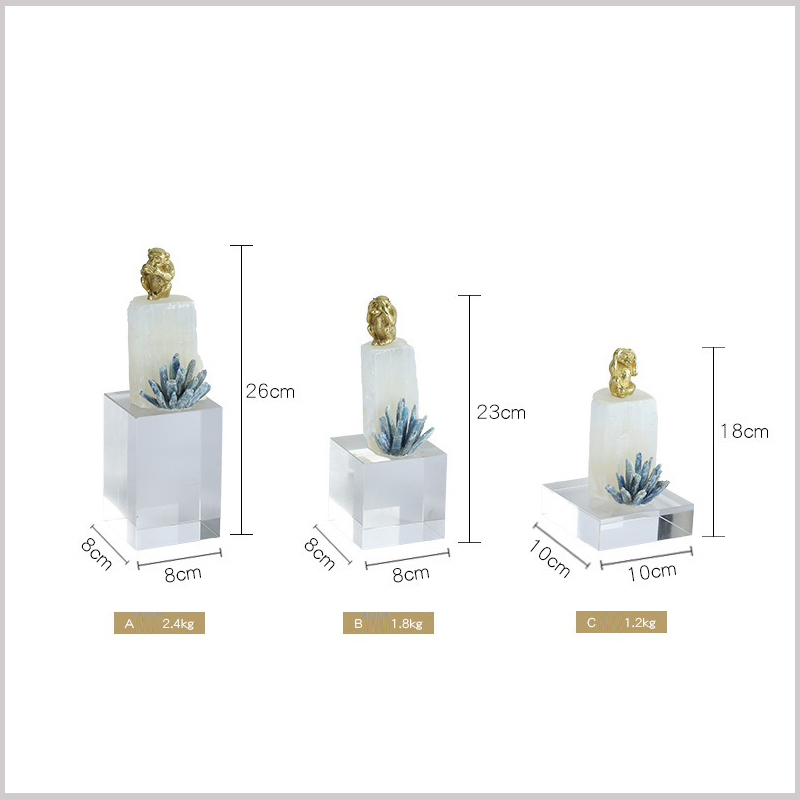 - Nhỏ: D10cm * R10cm * C18cm – Mô hình động vật kết hợp pha lê kích thước nhỏ này là sự lựa chọn tuyệt vời cho không gian phòng khách vừa và nhỏ. Bạn có thể đặt chúng trên các kệ tủ, bàn trà hoặc góc phòng để tạo điểm nhấn độc đáo mà không chiếm quá nhiều diện tích.