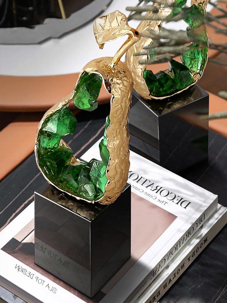 Mô hình này có thể được sử dụng để trang trí bàn trà, bàn tiếp khách hoặc những khu vực khác trong phòng khách, tạo nên sự sang trọng và độc đáo. Chất liệu của mô hình gồm pha lê, hợp kim và quặng, mang lại sự kết hợp hoàn hảo giữa sự quý phái của pha lê, độ bền của hợp kim và sự tự nhiên, độc đáo của quặng.