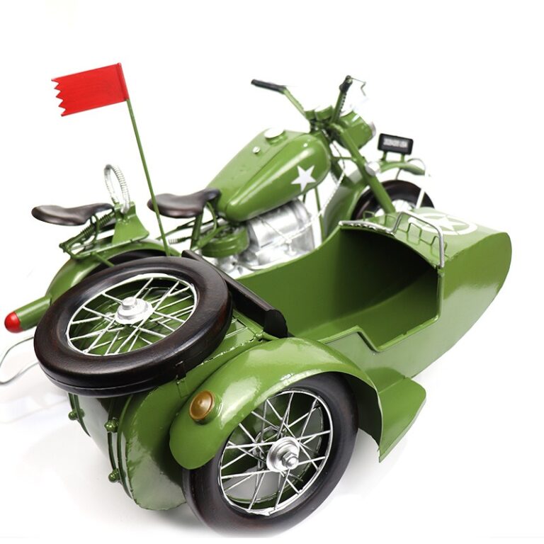 Mô hình sidecar vintage có thể được đặt trên bàn trà hoặc kệ trang trí phòng khách để tạo điểm nhấn mạnh mẽ. Sự kết hợp giữa màu xanh quân đội và thiết kế cổ điển sẽ làm cho không gian phòng khách của bạn trở nên ấn tượng hơn bao giờ hết.