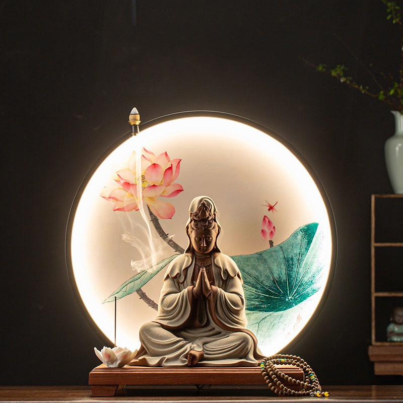 Thác Khói Trầm Hương Đèn Led Kết Hợp Tượng Quan Âm – Vật Phẩm Phong Thủy Mang Lại Bình An Và Tài Lộc
